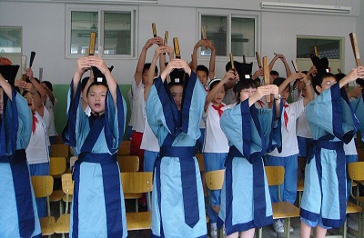 “驾长车,踏破贺兰山缺。壮志饥餐胡虏肉……”比赛在一首荡气回肠的诗朗诵《满江红》中拉开序幕,15个参赛队从《三字经》、《百家姓》、《弟子规》以及其它国学经典诗文中选取片段,自己配乐、编舞,配合武术、器乐等表演形式,形成了各具特色的诵读节目。