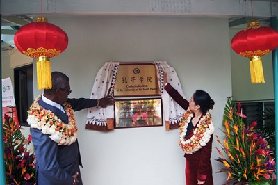 在南太平洋大学,有南太岛国地区第一所、也是当地目前唯一的孔子学院。穿过校园里的一条小径,首先映入眼帘的是孔子铜像。铜像彬彬有礼的模样,仿佛在欢迎人们来到中国语言和文化的海洋。孔子学院里面,整齐摆放着中文书籍和音像制品,其中有日常学习汉语所需的工具书,有诗词歌赋等古代文化典籍,还有介绍茶道、戏曲等内容的作品。展览室中陈列了剪纸、中国结、软硬笔书法等学生作品,散发出浓浓的中华文化气息。在南太大学孔子学院学习中国语言和文化的,有在校学生,有当地公职人员,还有私企员工等。