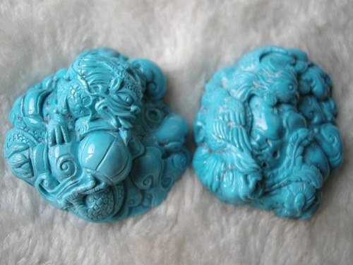 王树起进一步解释说,我国工艺美术界将绿松石主要分成三个等级。第一等级呈现天蓝色,颜色纯正均匀,而且光泽度高,表面呈现玻璃感,半透明或者微透明。质地细腻坚韧,没有铁线,没有残缺。第二等级是深蓝色或者蓝绿、翠绿色,光泽较强,微透明。质地坚韧,铁线或其他缺陷很少,块度中等。第三等级呈浅蓝或蓝白、浅黄绿等颜色,光泽较差,质地比较僵硬,铁线明显,或白脑、筋、糠心等缺陷较多,块度大小不等。