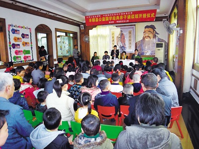据了解,该诵读班以国学教育为切入点,通过发挥国学经典对父母、子女的熏陶渐染作用,从而进一步提升思想道德素质和文化素养,促进亲子和睦、家庭和谐。开班仪式后,该诵读班于每周六上午向全县少年儿童及家长免费开放,为该县广大家长和少年儿童提供了一个学习传统文化、诵读国学经典的平台。