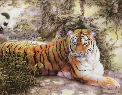 再说那只老虎,早已饿了多时,一见有东西过来,就要往上扑。可那东西不但役逃,还站住了,在那边远远看着自己。老虎一阵奇怪,仔细看了看,乖乖,原来是只大狮子!要是打不过可惨了,好汉不吃眼前亏,还是快溜吧!