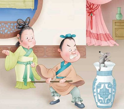 于是,他操起一根木棍,蹑手蹑脚走到大花瓶跟前,举起木棍正要砸下去,冷不防被一双手将木棍抓住了,原来是他的妻子从厨房过来看到,紧急救“驾”的。他妻子一边抓住木棍一边阻止他说:“你不能这样!你没看到这是我们家的古董吗?要是把这只大古董花瓶打碎了,那多可惜呀!为了打一只老鼠,也未免太不值了。”