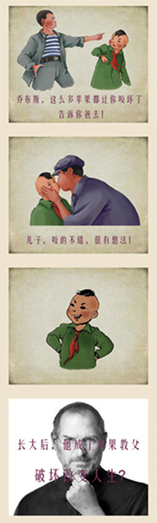 “破坏改变人生”从内容上与“妈妈在我打一次”相比较,第一副图:儿子搞破坏被人发现,要举报,第二幅图:儿子的父亲没有责备他,反而赞许儿子。第三幅图:儿子大笑(感觉就是得意),第四幅:儿子取得成就,破坏改变人生。从内容上看,该作似乎是与“妈妈”大唱反调,告诉大家:孩子在进行破坏之后的鼓励是有良好的正面效应的。在这里教育专家告诉大家:绝对不可能有成就,孩子一再犯错误,家长一再容忍,只会让孩子在破坏的道路上越走越偏,最终的结果就是变成混世魔王,根本不可能成为球星之类的人生赢家。网友千万不要被漫画所误导,看似正能量的的背后,实则还是一种变向的家庭暴力。