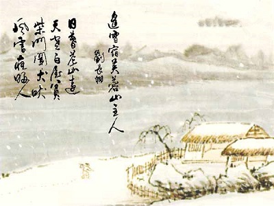 【图语:《逢雪宿芙蓉山主人》,体裁为五言绝句,唐代诗人刘长卿所作】