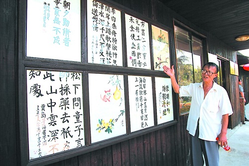 10点不到,外面已骄阳似火。在岛上一间木板建成的校外辅导站里,20多个不同年龄的孩子被分成书法、绘画、作文等小组,朱能养和另外几位退休教师就是辅导老师。朱能养负责的是书法和绘画,只见他拿着笔,从握笔姿势,再到图画每一笔着色,他都十分耐心地教着。由于孩子太小,做示范时,他只能站着俯下身子,趴在孩子们的课桌上,汗水不时从老人额头一滴一滴地掉落。