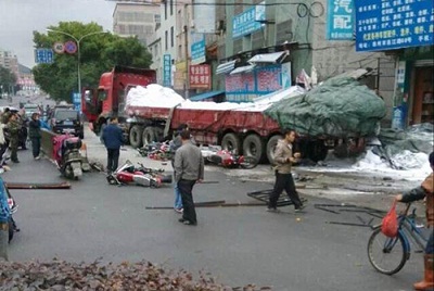 目击者上传网络的照片显示,货车车头已经严重变形,车上所载白色粉末状物体已经散落地上,现场多部摩托车被冲倒在地,有两人倒在路边。