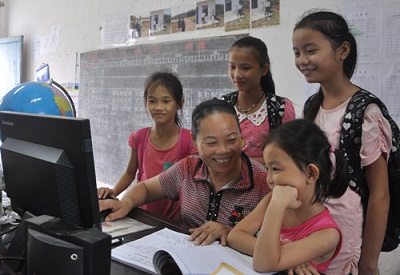 近年来,海南省儋州市委、市政府大力发展教育,计划2015年投入1000万元发展教育信息化,重点推进农村教育信息化建设,让该市边远地区农村学校与城里学生一样同享优质教育资源。图为儋州市兰洋镇番打小学黎族教师王金花在教学生正确使用网络。记者 刘见 摄