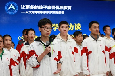 近年来,人大附中每年都会迎来300多名来自西部地区和北京郊区人大附中分校的“留学生”。在近日召开的全国社会扶贫先进集体和先进个人表彰大会上,人大附中荣获“全国社会扶贫先进集体”称号,是唯一一所入选全国扶贫先进集体的普通中学。