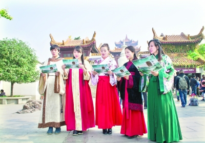 “名楼景区,城市形象;百年商埠,诚信经营;讲求文明,安居乐业……”22日,黄鹤楼景区出现了一群身穿汉服的大学生,在老师的带领下齐声诵读“黄鹤文明谣”,吸引了不少市民驻足观看。