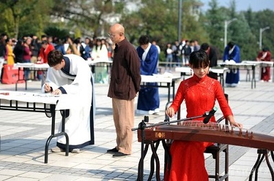 近日,湖南科技学院近千名师生陶醉在悠扬婉转的古筝声中,闻着淡淡的茶香,欣赏了一场汉服学子现场挥毫泼墨的视觉盛宴。