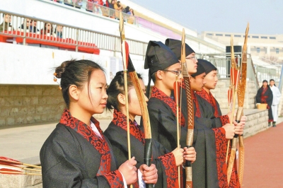 “弃软弱之品,拾勇武之志。”作为汉服文化周的重头戏,“甲午射礼”以其独特的方式成功吸引了众人的眼球。12月7日上午,河大学子复原的乡射礼在金明校区志义体育场精彩上演。寒风中,射者精神抖擞,拉弓动作充满力度,一支支箭羽凌空而出,射向靶心,两位女生巾帼不让须眉,展现了河大学子的进取精神和勇武气质。从迎宾、献宾到一番射、二番射再到三番射、宴宾,一个个环节诠释着中国传统礼仪的博大精深。