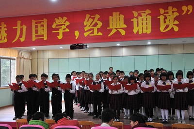 国学示范课上,王蓉执教国学经典诵读课《笠翁对韵·四支》,引导同学们以多种形式读韵文。在第二堂课上,厚德小学陈永将老师执教国学经典诵读课《谢太傅盘桓东山》。两堂课上,共有近百名学生聆听。