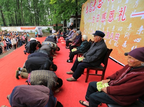 据悉,5月8日这天,为传承孝道文化,迎接母亲节的到来,临颍县瓦店镇刘庄村举行了一场别开生面的“感念亲恩,传承孝道”生日感恩礼,当天过生日的7位上有老下有小的父母要集中为自己的父母磕头、洗脚。刘庄村党支部书记尚纪安看到有位孤寡老人临时走上台前等待磕头和洗脚,自己就赶紧上前带领其他7位老人的子女先给老人们磕头,再给老人们洗脚,最后是老人、孩子、上有老下有小的父母共同分享上日蛋糕