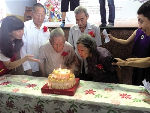 【图语:慈孝生日宴上老人在吹蜡烛】