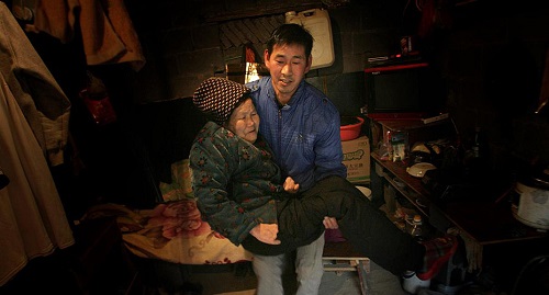 上周末,记者来到位于甘井子区樱花街的大化集团医院,在二楼病房见到刘先生,此时,他正扶着骨瘦如柴的老母亲坐起,92岁的老人见到记者微笑点头,而刘先生把脸紧紧贴在母亲额头上,眼泪止不住地流下,激动之情溢于言表。