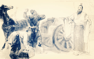 孔子一行出了曲阜,天色将晚,下起了蒙蒙细雨。马车来到一处十字路口,子路不知该向哪个方向行走,便问孔子。孔子答非所问地说:“尔行何其速也,且慢行。”他恋恋不舍地从车窗探出头来,向四周凝望……