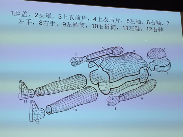 那么,玉衣是怎么制作的呢?李先生在讲座中对玉衣的形制与制作工艺也做了介绍。我们在博物馆看到的复原之后的玉衣是一个整体,实际上是可以拆卸的。玉衣大体上由头套、上衣、裤筒、手套、鞋套五大部分组成,其中头套又由脸盖和头罩构成,上衣由前后衣片和左右袖筒构成。玉衣的袖筒、裤筒的开缝都设置在内侧,手套的开缝在手掌,鞋的开缝在脚跟。